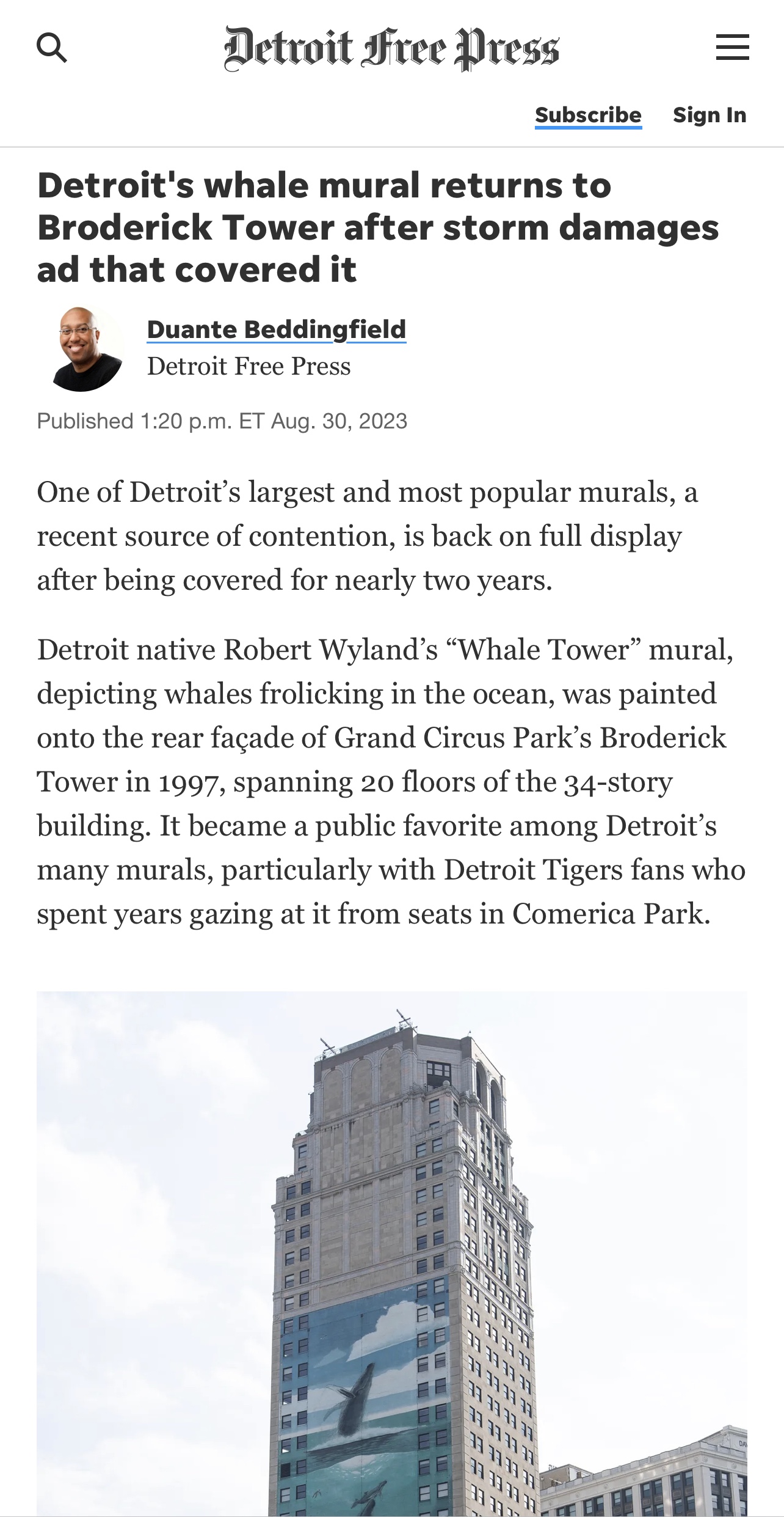 Wyland, Detroit’s whale mural artist, calls for protection of public art. Sarah Rahal writes more about it at Detroit News.