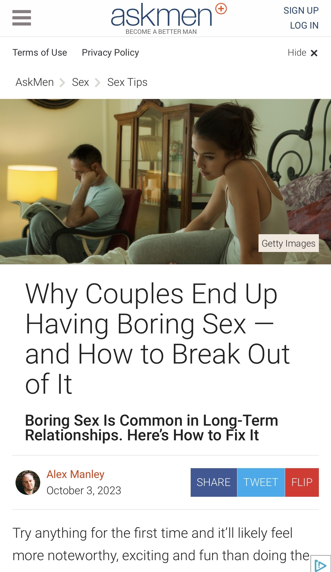 “Good sex requires a balance of two factors — a feeling of safety and feeling of novel excitement,” says Indigo Stray Conger, licensed marriage and family therapist and certified sex therapist with Mile High Psychotherapy and ThatSexQuiz.com.Thanks to Alex Manley for covering this with a client’s advice. Read more at AskMen.