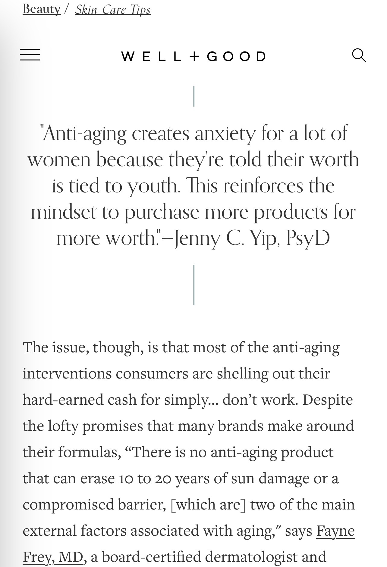 Jaclyn Smock writes about the messaging aimed at women to sell anti-aging products. Dr. Jenny Yip explains the psychological effect of campaigns that push products which many times don’t even work, according to dermatologists cited in the article.